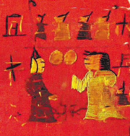 武威磨嘴子72號漢墓出土一塊絹底刺繡人物圖,上繪吏人,頭戴尖頂幘,身穿窄袖緊身衣。1972年武威磨嘴子4號墓、23號墓和25號墓共出土了三件蓋在棺板上的絲織銘旌,上面繪有日月蟾蜍圖像,日中有三足鳥,月中有玉兔。武威磨嘴子一號墓出土廣山錦三塊??椃邦伾嗤?,是墓主人的覆面及覆蓋物。棕色底,黃、褐、白三色顯花。在變體云紋之間,織有青龍、白虎,作相對奔走狀。在龍、虎紋中間織“廣”“山”二字。此外,還有織錦衣領邊飾帶一條,為上衣領口邊飾。黃地,淡黃、褐、橘黃、石藍顯花,斜經(jīng)組織。上下間以長方格對稱隔離,內用淡黃、褐色織出龍虎等圖案,中間夾織橘黃、石藍色間隔的長形條帶。這些文物都是甘肅紡織畫的代表作。