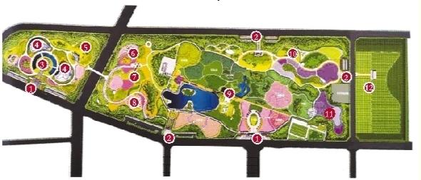 蘭州植物園二期規(guī)劃平面示意圖。 11 ①主入口 ②次入口 ③鏡湖云游 ④溫室植物園 ⑤藥用植物園 ⑥珍稀植物園 ⑦纖維植物園 ⑧兒童植物園 ⑨蘭州特色園 ⑩旱生植物園 彩葉植物園 生態(tài)培育 12