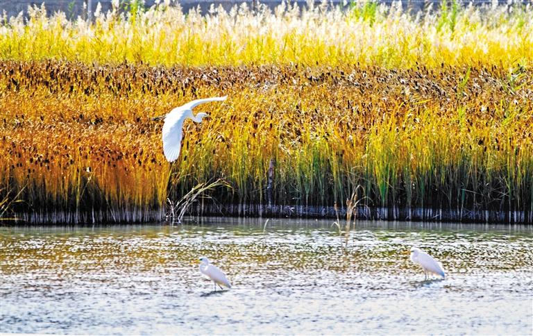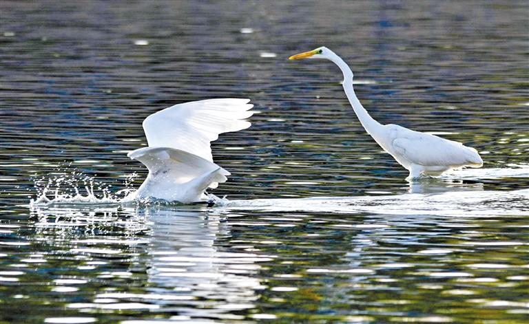 10月上旬,鳴沙山下大片水域吸引了大批的白鷺、白天鵝、鸕鶿、鷗鳥前來嬉戲、覓食。