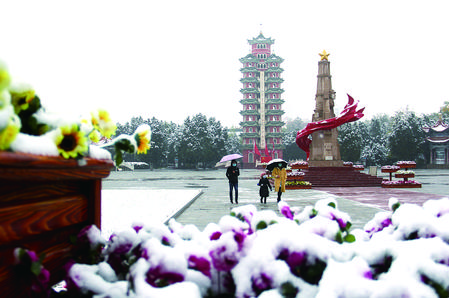 10月27日,游客冒雪參觀甘肅紅軍會(huì)寧會(huì)師舊址。當(dāng)日,會(huì)寧縣迎來(lái)今秋首場(chǎng)降雪。 常琦彪 攝