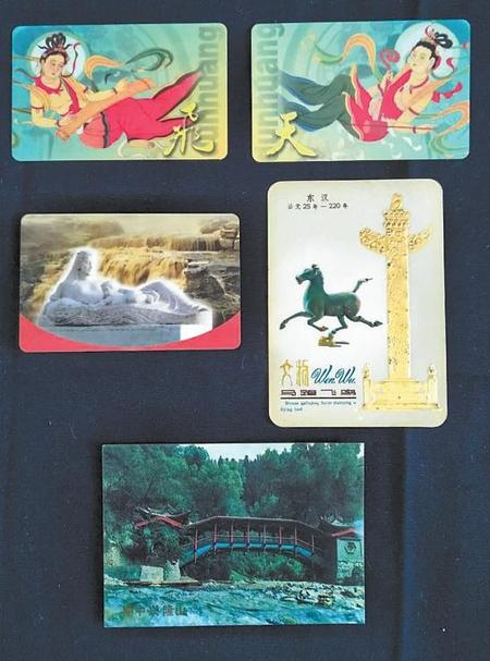 甘肅的自然風(fēng)光優(yōu)美,人文歷史悠久,經(jīng)過不斷挖掘,精心保護(hù),成為人們旅游、觀光的理想之地。北京中鈔信用卡廠于2001年制作的“飛”字片、“天”字片“飛天”對卡年歷片,中國工商銀行甘肅分行于2000年設(shè)計了《黃河母親》年歷片,中國農(nóng)業(yè)銀行甘肅分行于1987年設(shè)計的《興隆山握橋風(fēng)光》年歷片,中國遠(yuǎn)洋運輸公司上海分公司于1978年制作的《馬踏飛鳥》年歷片,都為甘肅旅游風(fēng)光作了宣傳。