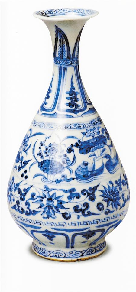 青花瓷的青色因?yàn)樗貎簟⒀胖?、清新而深受人們喜歡,從唐朝創(chuàng)燒到元代臻于成熟,再到明清盛燒不絕,青花瓷甚至已經(jīng)成為中國(guó)風(fēng)的一個(gè)標(biāo)志。奇妙的青花得益于青料的使用,在元代青花瓷中,所使用的青料主要有兩種。進(jìn)口青料,俗稱(chēng)蘇麻離青,它們通過(guò)絲綢之路帶入中國(guó),其原產(chǎn)地位于盛產(chǎn)鈷礦的伊拉克索馬拉。進(jìn)口青料的成分低錳、高鐵,青花成色純正、深沉、濃艷,會(huì)有深藍(lán)、翠藍(lán)、紫藍(lán)的不同色彩呈現(xiàn),色料堆積厚的地方會(huì)有黑色的鐵銹斑。國(guó)產(chǎn)青料的成分則高錳、低鐵,青花成色青藍(lán),偏灰黑。