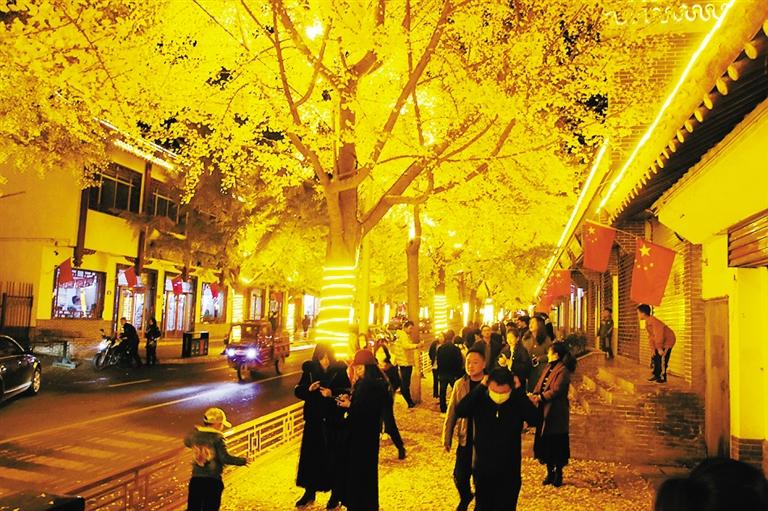 立冬前后,被稱為“黃金大道”的天水市青年南北路銀杏一條街,黃葉飛舞一地金黃,迎來一年中最佳觀賞期。 天水市秦州區(qū)青年南北路全長700余米,道路兩側種滿了銀杏樹。落葉季節(jié),每到夜幕降臨后,銀杏樹上的LED金黃色燈帶亮燈后,整條街黃葉黃燈交相輝映,璀璨奪目,成了市民近日遛彎首選的“打卡”地。