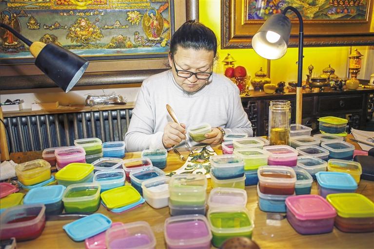 據(jù)李海明介紹,近年來(lái),經(jīng)常會(huì)受邀代表甘肅省文創(chuàng)去省外參展,而每次展出的琺瑯文創(chuàng)產(chǎn)品都會(huì)受到來(lái)自各地的年輕人的好評(píng)。“有時(shí)會(huì)把不同人創(chuàng)作的壁畫、唐卡等擺在一起展出,總有很多年輕人在我的作品前逗留良久,這說(shuō)明他們對(duì)我的琺瑯釉色彩是非常認(rèn)可的。”