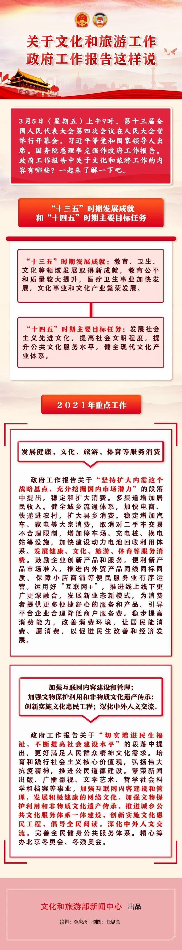 3月5日,第十三屆全國人民代表大會(huì)第四次會(huì)議在北京人民大會(huì)堂開幕。國務(wù)院總理李克強(qiáng)作政府工作報(bào)告。政府工作報(bào)告中關(guān)于文化和旅游工作的內(nèi)容主要包括以下幾個(gè)方面: