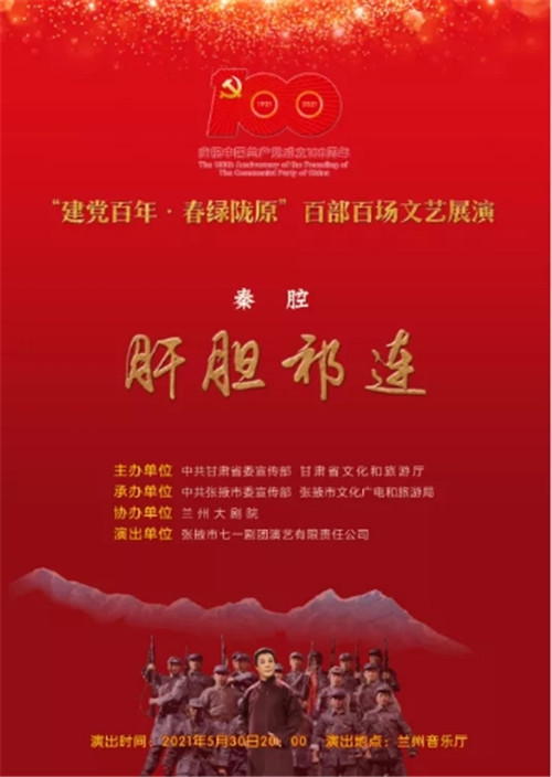 中國甘肅網(wǎng)5月28日訊(本網(wǎng)記者 宋芳科)5月30日晚,剛剛斬獲第六屆甘肅戲劇紅梅獎(jiǎng)大賽“紅梅劇目獎(jiǎng)”第一名的好成績的秦腔戲《肝膽祁連》,將在蘭州音樂廳精彩上演。《肝膽祁連》以真實(shí)的歷史故事改編,講述了民主人士高金城營救紅西路軍戰(zhàn)士的感人故事。屆時(shí),中國甘肅網(wǎng)將現(xiàn)場直播,歡迎廣大網(wǎng)友點(diǎn)擊進(jìn)入直播間,重溫一段波瀾壯闊而又感人至深的歷史,一起向祁連英魂高金城致敬。