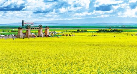 沿著國道227行走,放眼望去,遠(yuǎn)處祁連山脈高峰聳立,近處起伏的山丘高低錯落,山間綠草如茵,色彩斑斕的野花星星點(diǎn)點(diǎn)播撒在綠草之中。山坡上點(diǎn)綴的牛羊安靜地吃草,呈現(xiàn)出一派安靜祥和的田野風(fēng)光。最耀眼的當(dāng)屬這里的油菜花,處處可見金黃一片,成為七月河西走廊一道亮麗的風(fēng)景。