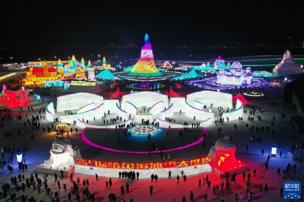 2021年12月25日,游客在哈爾濱冰雪大世界園區(qū)游玩(無人機照片)。