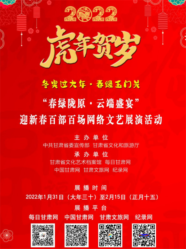 甘肅省博物館在春節(jié)期間舉辦了“虎虎生福——壬寅(虎年)新春生肖文物聯(lián)展”,甘肅省圖書館舉辦7大專題30余項文化體驗活動。在“春之華章”2022年甘肅省電視春節(jié)聯(lián)歡晚會上,原創(chuàng)話劇《八步沙》、隴劇《大禹治水》等精彩上演;甘肅省非遺保護中心開展了“虎虎有神過大年——如意甘肅·多彩非遺”宣傳推廣活動;甘肅演藝集團通過線上線下結(jié)合方式,開展2022“我們的中國夢”——文化進萬家迎新春文藝演出活動;張掖市舉辦春節(jié)“九曲黃河燈陣啟燈納福非遺文化展演”活動。