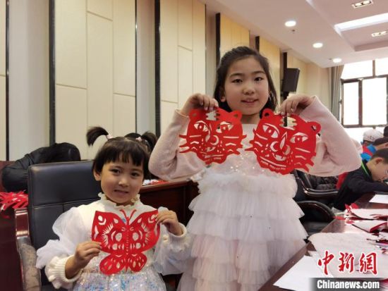 圖為蘭州孩童展示剪紙作品《小老虎》《蝴蝶》。 徐雪 攝