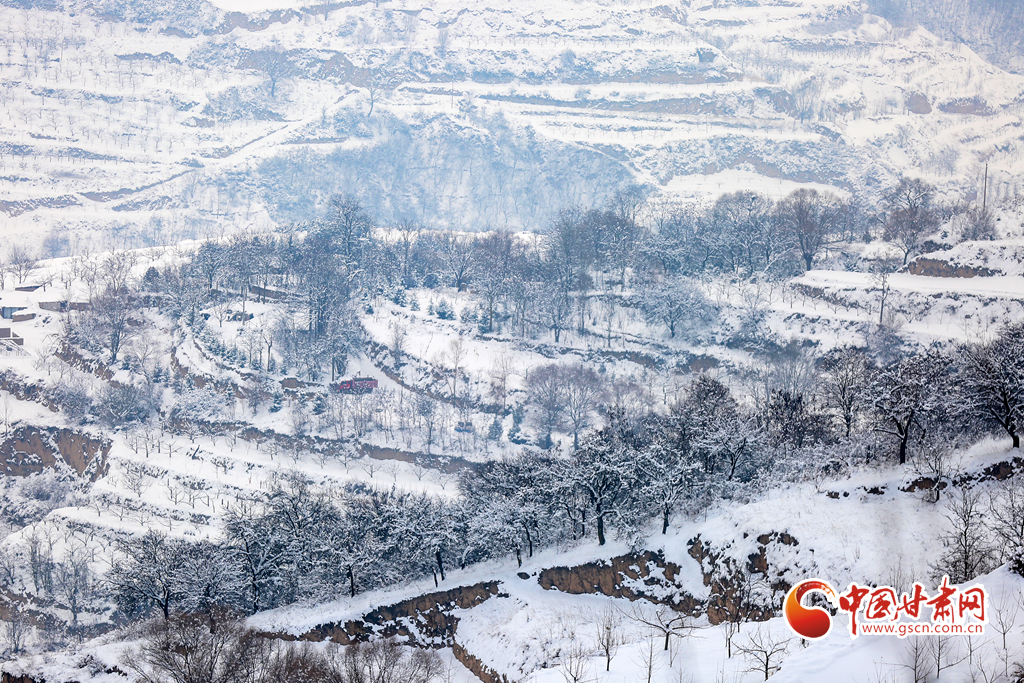 2月8日,雪過(guò)天晴,甘肅省平?jīng)鍪徐o寧縣賈河鄉(xiāng)侯山村銀裝素裹,美不勝收。果園、梯田、房屋、公路及遠(yuǎn)山構(gòu)成了一幅天然的鄉(xiāng)村畫(huà)卷。