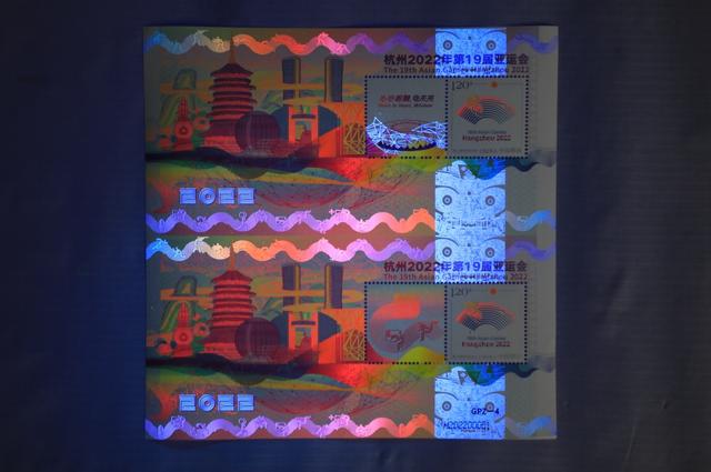 據(jù)了解,《杭州2022年第19屆亞運會》特殊版式個性化郵票雙連張是中國集郵有限公司匠心打造的首款GPZ編號體育題材郵票,由青年設(shè)計師趙郁竹擔(dān)綱設(shè)計,限量發(fā)行。它依托杭州亞運會色彩系統(tǒng)和視覺形象元素,融歷史文化、現(xiàn)代美學(xué)和未來暢想于一體,集藝術(shù)感、科技感和運動感于一身,展現(xiàn)中華文明、浙江風(fēng)采、杭州韻味和時代魅力,采用特殊版式、編號和工藝,紫光燈下局部呈現(xiàn)無色熒光油墨圖案和全真彩效果,傳遞中國郵政對杭州亞運的美好祝福。(圖片由人民日報客戶端提供)
