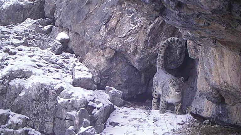 視頻中,這只雪豹巡視著自己的領(lǐng)地,并在鏡頭前留下了自己的氣味標(biāo)記。據(jù)陸橋生態(tài)中心雪豹研究團(tuán)隊李祎斌判斷,這是一只雄性成年雪豹。