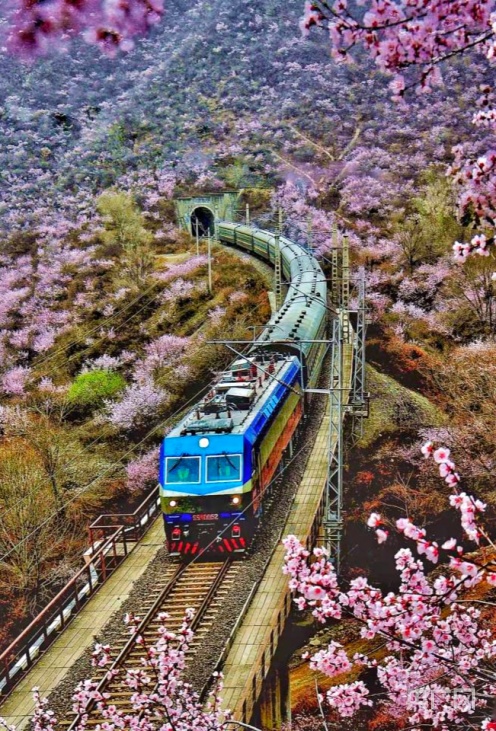 央廣網(wǎng)蘭州4月2日消息 (記者 邸文炯 通訊員 王紅剛 孫淑霞)近日,甘肅省崇信縣峽門寶中鐵路華亭市安口窯站附近的山上桃花盛開,花香四溢、如煙似霞。火車從山中的隧道穿行而過,駛向一片春光燦爛。