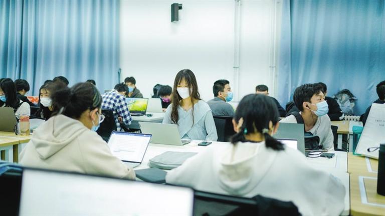由于防疫原因,該校新聞與傳播學院李娟老師采取了線上與線下相結合的方式進行教學。雖然老師不在教室中,但是該學院2021級專碩班的同學們仍然坐得整整齊齊,認真地上課、記錄筆記。研究生謝文新表示,“非常開心大家重新回到了同一個教室里。很久未見,格外期待與彼此進行面對面的交流討論。雖然老師和一些同學暫時還沒有回到教室,但是完全恢復以往的學習生活指日可待。”