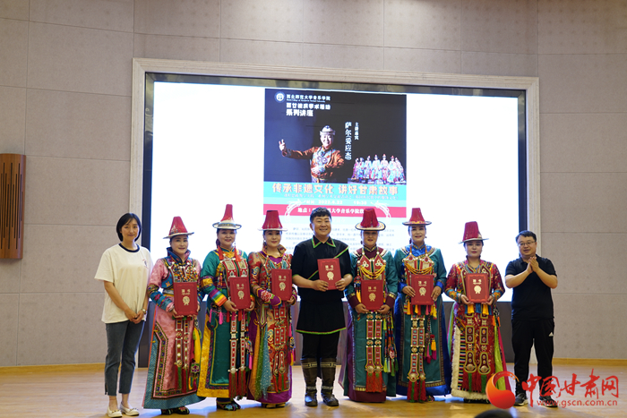 中國(guó)甘肅網(wǎng)7月1日訊 近日,甘肅裕固族歌唱組合薩爾組合主唱薩爾帶著他的裕固族伙伴們走進(jìn)西北師范大學(xué)音樂學(xué)院,進(jìn)行“課程思政教學(xué)實(shí)踐”——《裕固族民歌中的服飾文化》交流分享活動(dòng)。同時(shí),西北師范大學(xué)音樂學(xué)院副院長(zhǎng)晏曉東為七位裕固族民間音樂傳播者頒發(fā)了音樂學(xué)院聘書。