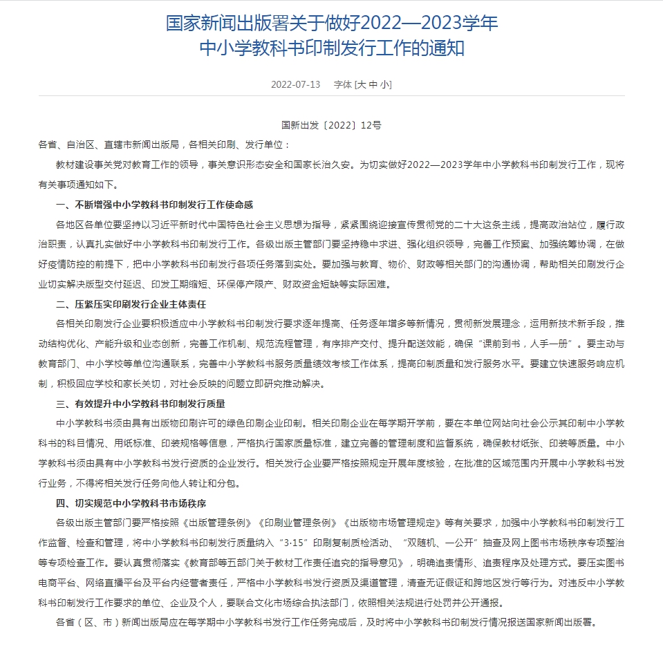 針對(duì)中小學(xué)教科書(shū)印制發(fā)行等環(huán)節(jié),《通知》中表示要有效提升中小學(xué)教科書(shū)印制發(fā)行質(zhì)量。