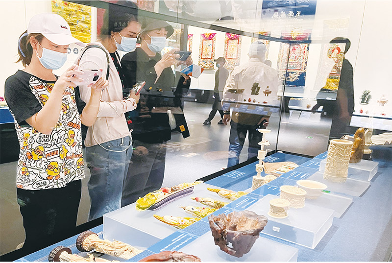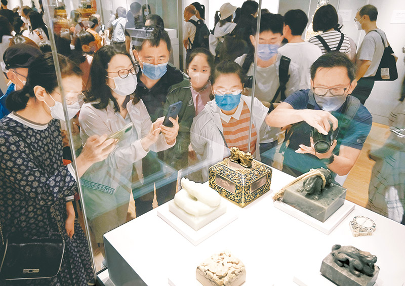 2022年7月3日,香港故宮文化博物館正式對(duì)公眾開放參觀。圖為觀眾在香港故宮文化博物館展廳內(nèi)參觀拍照。 新華社記者 王申/攝