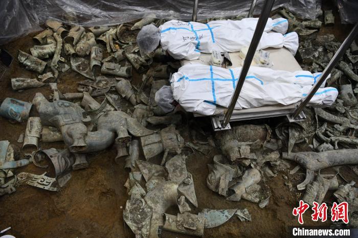 8號祭祀坑等待提取的精美文物?!埨?nbsp;攝