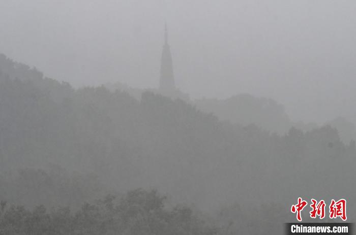 圖為西湖保俶塔在大雨中若隱若現(xiàn)?!⊥鮿偂z