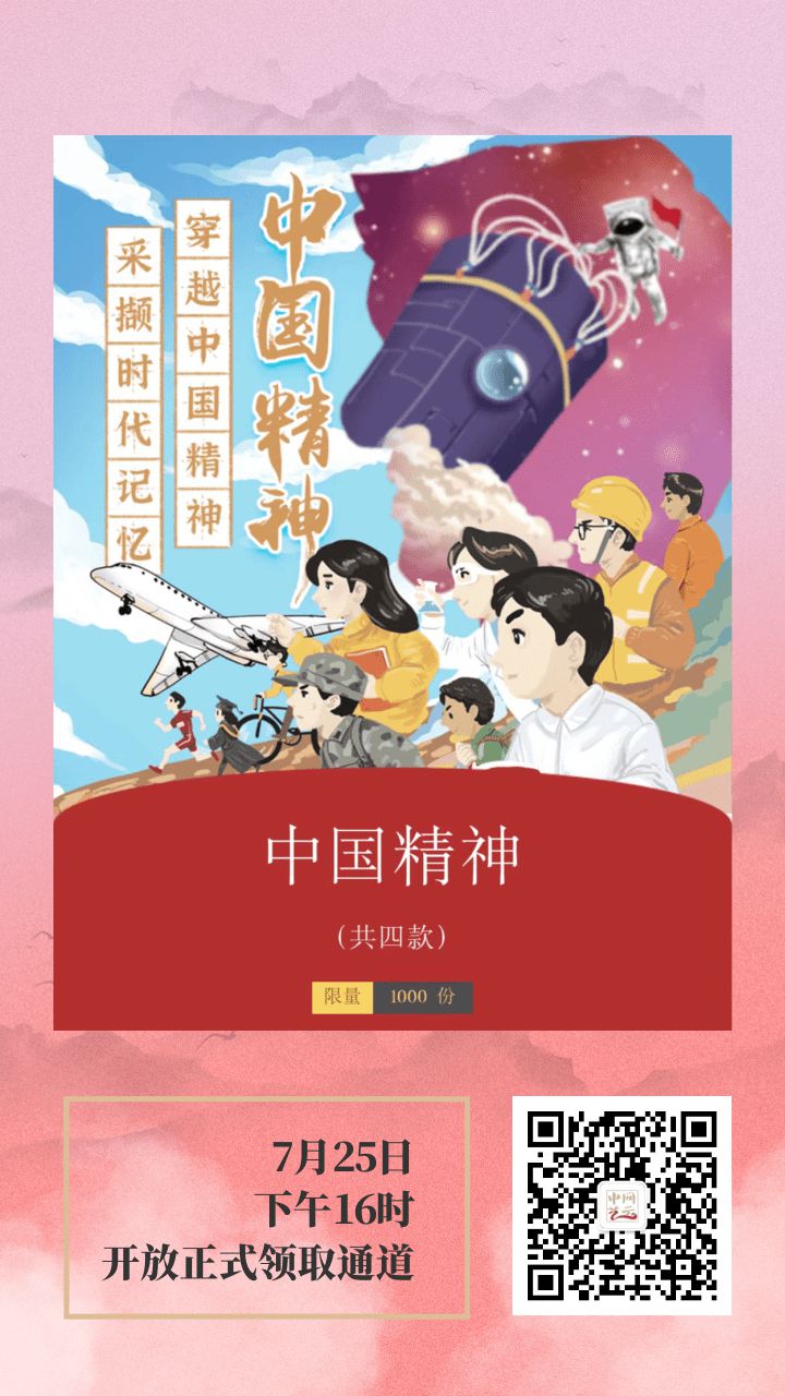 7月25日下午16時(shí),中國網(wǎng)旗下中網(wǎng)藝云數(shù)字藏品平臺(tái)發(fā)布上線首批藏品并將開放正式領(lǐng)取通道,大眾通過中網(wǎng)藝云線上渠道可對(duì)《中國精神》系列藏品進(jìn)行免費(fèi)領(lǐng)取。本期藏品總數(shù)量1000份,共四款,全部用于免費(fèi)發(fā)行。其中歷史主動(dòng)精神400份、首創(chuàng)精神300份、航空強(qiáng)國精神200份、抗疫精神100份,采取“盲盒玩法”隨機(jī)獲取。