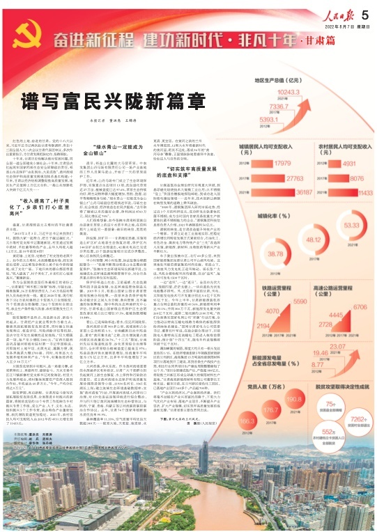 8月7日,人民日?qǐng)?bào)刊發(fā)“奮進(jìn)新征程 建功新時(shí)代·非凡十年”甘肅篇,重磅推出兩塊整版,聚焦黨的十八大以來(lái),隴原兒女牢記習(xí)近平總書記的殷切囑托,踔厲奮發(fā)、銳意進(jìn)取,埋頭苦干、勇毅前行,加快建設(shè)幸福美好新甘肅,不斷開創(chuàng)富民興隴新局面。