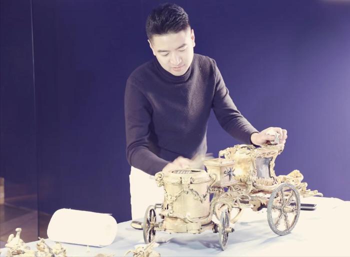 “這件‘魔術人鐘’功能比較復雜,經(jīng)過長期開動后,出現(xiàn)了一點故障,就存放在了庫房。”亓昊楠說,自己和師父王津一起修復這座鐘表時,才發(fā)現(xiàn)它的內(nèi)部系統(tǒng)有多精細。