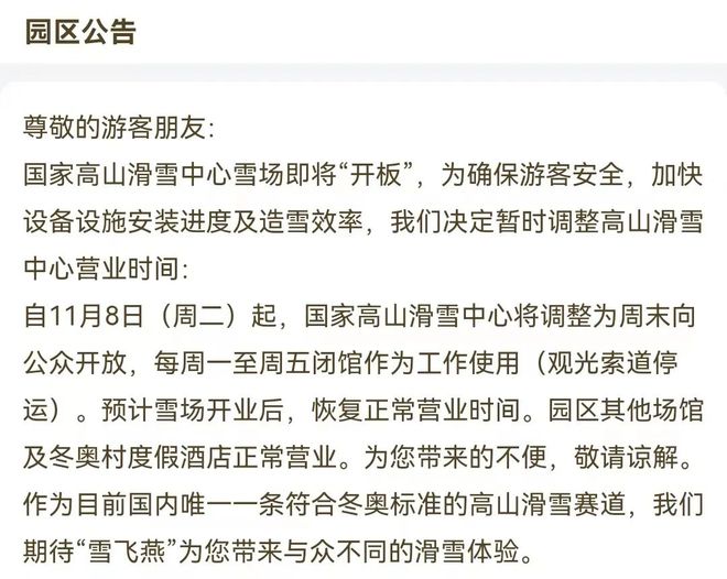 根據公告,自11月8日(周二)起,國家高山滑雪中心將調整為周末向公眾開放,每周一至周五閉館作為工作使用(觀光索道停運)。預計雪場開業(yè)后,恢復正常營業(yè)時間。目前,“雪飛燕”已對外開放,如果纜車開放,便可以乘坐纜車上到山頂。