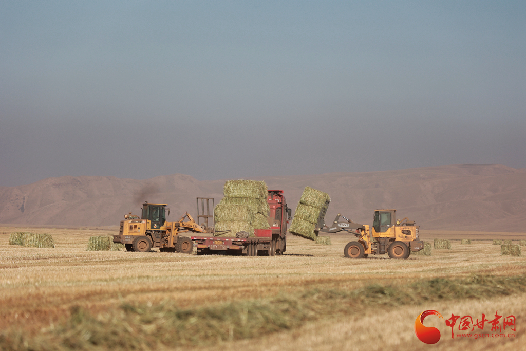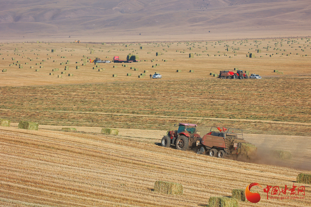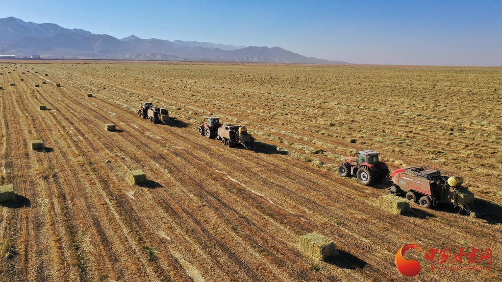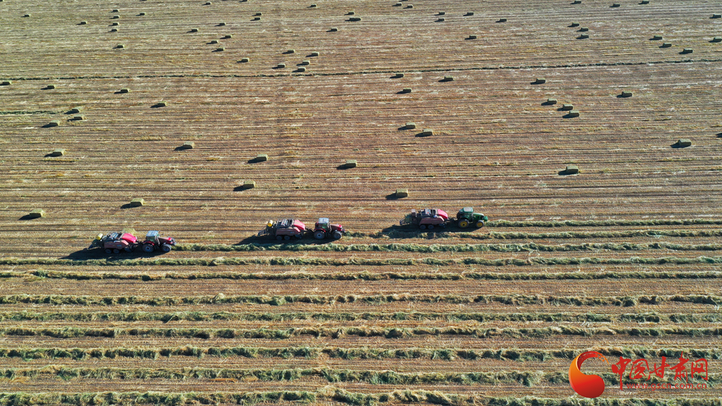 11月9日,甘肅山丹馬場(chǎng)正在對(duì)此前收割晾曬的21萬畝燕麥草打包運(yùn)輸,一輛輛大型農(nóng)用機(jī)械穿梭田間忙碌作業(yè)。