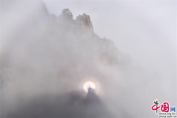 原標(biāo)題:安徽黃山:云海和佛光演變?nèi)鐗羧缁靡饩?/p>