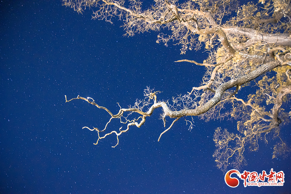 古槐樹夏季枝繁葉茂,身姿卓越;冬季樹葉凋落,顯露出它曠古的肌膚和清晰的骨骼,蒼遠巨偉。天氣晴好的時候,可以拍到星空與古槐生命與時空的結(jié)合,感嘆生命的頑強與奇妙。