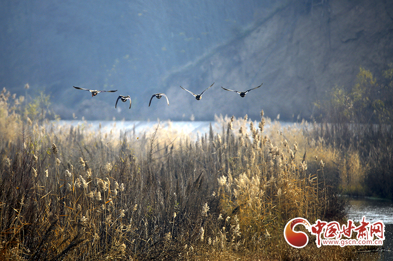 冬日的平涼市崇信縣,無人機鏡頭下的唐帽山山巒疊嶂、俊秀奇威,高大的樹木直插云霄,在云霧繚繞中宛若仙境;汭水河畔,成群的綠頭鴨時而佇立枝頭,時而輕舞飛翔,時而戲水覓食。