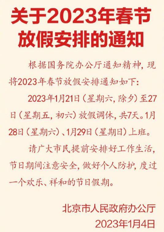 1月4日,北京市人民政府辦公廳發(fā)布《關于2023年春節(jié)放假安排的通知》(以下簡稱《通知》)。《通知》指出,根據(jù)國務院辦公廳通知精神,現(xiàn)將2023年春節(jié)放假安排通知如下:2023年1月21日(星期六,除夕)至27日(星期五,初六)放假調(diào)休,共7天。1月28日(星期六)、1月29日(星期日)上班。