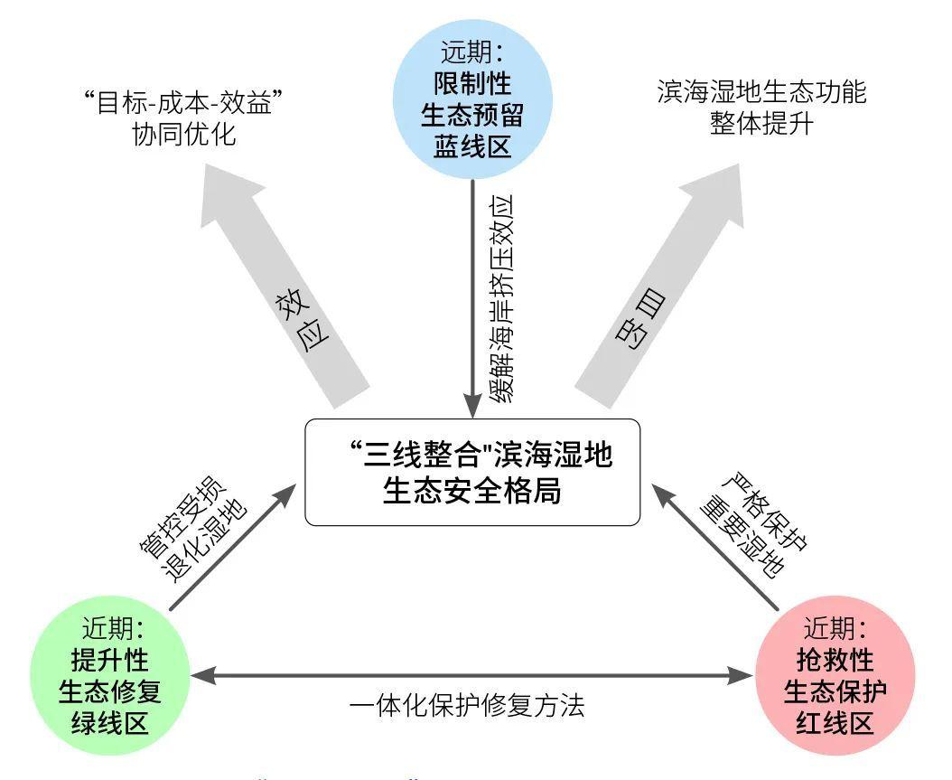 據(jù)此,文章提出了應(yīng)對圍墾開發(fā)和適應(yīng)海平面上升情形下“三線整合”中國濱海濕地生態(tài)安全格局相關(guān)概念,包括:搶救性保護生態(tài)紅線區(qū),優(yōu)先開展?jié)竦匦迯?fù)的生態(tài)修復(fù)綠線區(qū),以及適應(yīng)氣候變化影響下海平面上升的生態(tài)預(yù)留藍線區(qū)。文章在剖析相關(guān)概念的基礎(chǔ)上,聚焦我國大江大河三角洲,針對濱海濕地保護修復(fù)、海岸帶管理和國土空間開發(fā)提出了相關(guān)措施和建議。