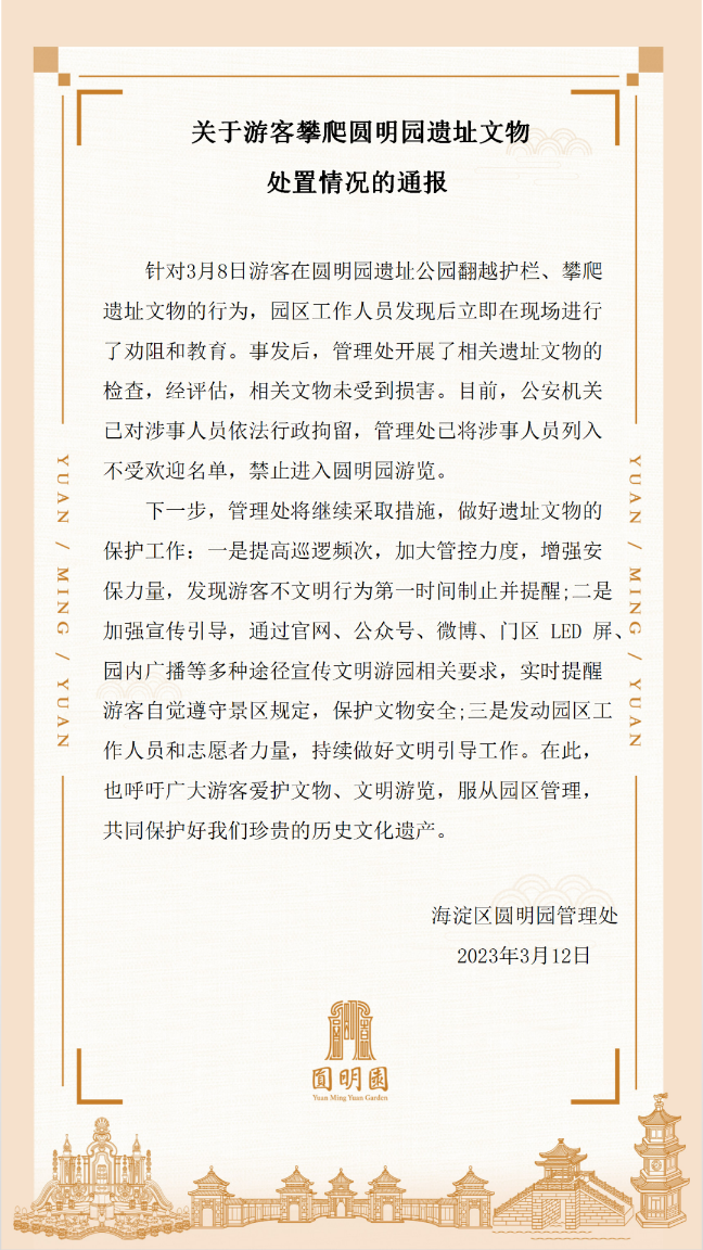 《通報》指出,針對3月8日游客在圓明園遺址公園翻越護欄、攀爬遺址文物的行為,園區(qū)工作人員發(fā)現(xiàn)后立即在現(xiàn)場進行了勸阻和教育。事發(fā)后,管理處開展了相關(guān)遺址文物的檢查,經(jīng)評估,相關(guān)文物未受到損害。目前,公安機關(guān)已對涉事人員依法行政拘留,管理處已將涉事人員列入不受歡迎名單,禁止進入圓明園游覽。
