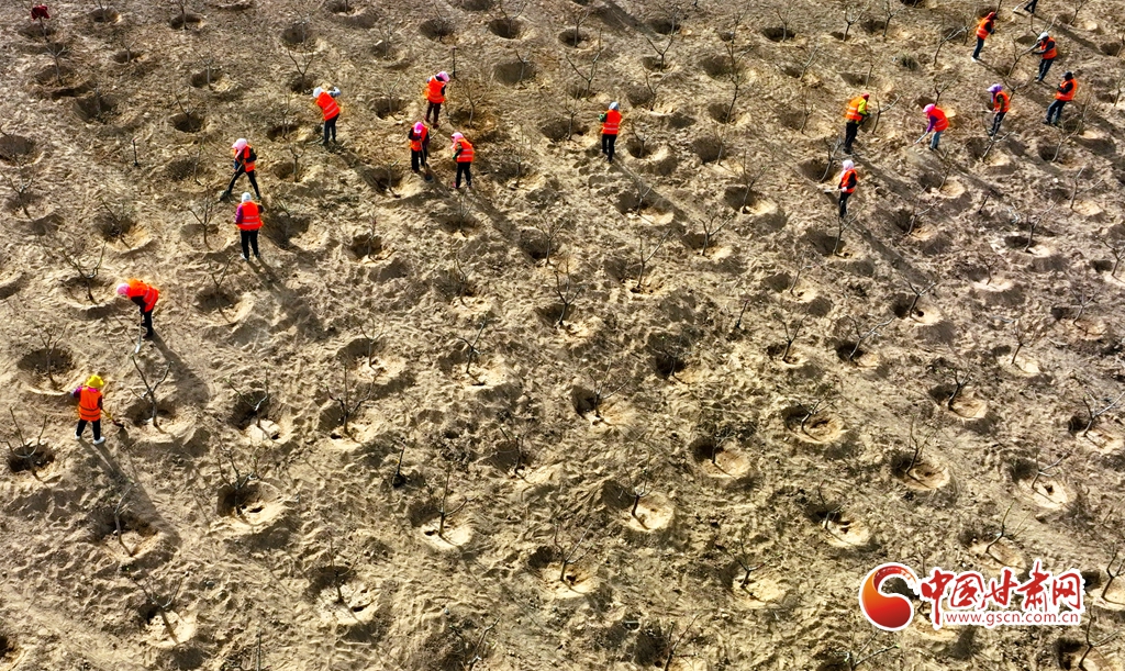 4月11日,在甘肅省張掖市甘州區(qū)黑河西岸黑河灘彩虹林海生態(tài)造林示范區(qū)內(nèi),眾多干部職工正在植樹。