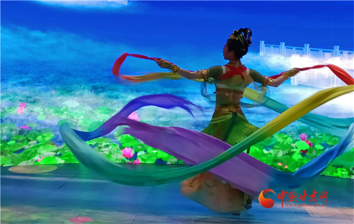 如意甘肅館選擇“以鹿王本生圖”中的綠色作為設(shè)計(jì)的主色調(diào),將敦煌元素鑲嵌在展館各個(gè)角落。特別是門(mén)口的展演舞臺(tái),經(jīng)典舞劇《絲路花雨》展演的反彈琵琶、敦煌伎樂(lè)天等將觀眾帶入了有聲有色的敦煌,成為如意甘肅館的一大吸睛之處。