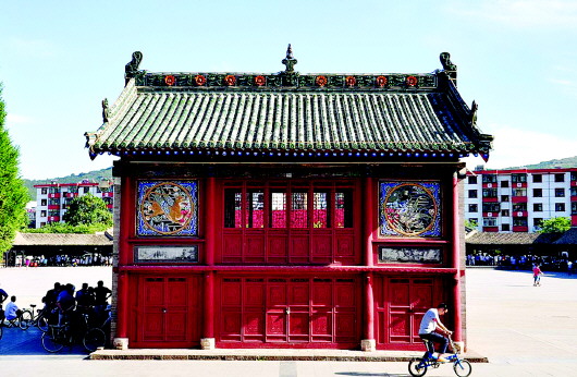 在伏羲城中,伏羲廟無疑是這座古城的中心和靈魂。廟區(qū)坐北朝南,總占地3萬多平方米,由廟前祭祀廣場、戲樓和三座牌坊構(gòu)成的廟前區(qū)和伏羲廟的廟區(qū)三大部分組成。在伏羲廟明清古建筑群中,第一座古建筑便是戲樓。