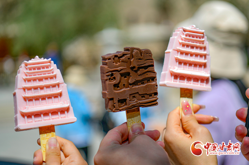 游客手拿莫高窟和九層樓文創(chuàng)雪糕,在莫高窟景點拍照打卡。
