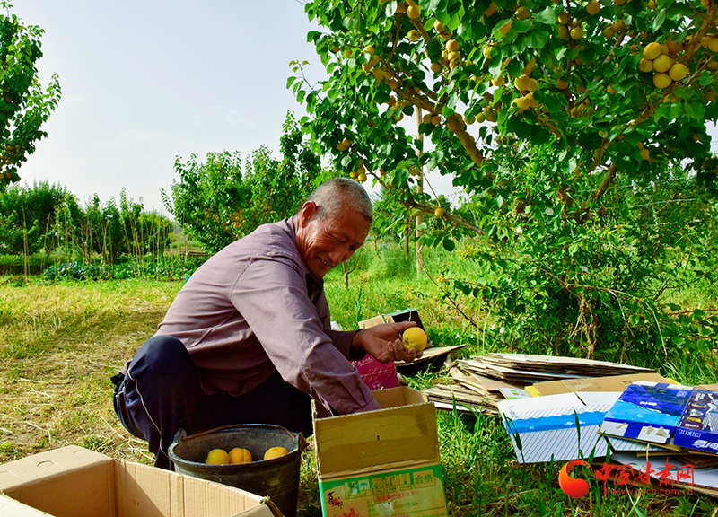 楊建國對(duì)采摘的大接杏進(jìn)行裝箱