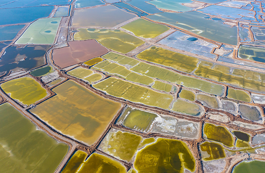 冬日時節(jié),隨著氣溫降低,山西運城鹽湖湖面上,色彩斑斕、景色如畫。芒硝結(jié)晶,“硝花”似雪,鹽湖里各種線條和幾何圖案,猶如大自然的調(diào)色盤,十分迷人。