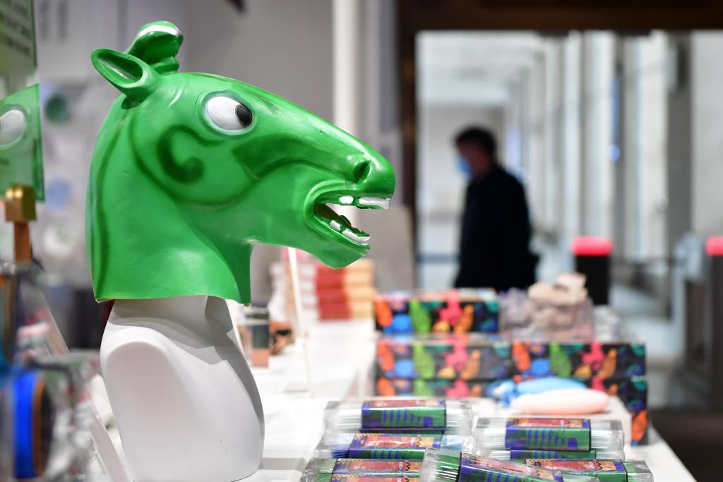 在甘肅省博物館文創(chuàng)商店拍攝的以銅奔馬為主題設計的“綠馬頭套”(2022年5月13日攝)。新華社記者 陳斌 攝