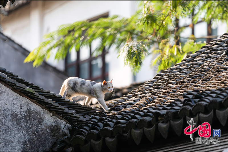 在毛孩子眼里,這就是包容一切活動的「游樂場」,片片青瓦上留下梅花印?;蛟S你也該往古鎮(zhèn)的屋頂上瞧,檐角翹伸、清風(fēng)古韻,讓人心曠神迷?;蛲侵回堃粯优噬细咛帲拼翱茨撬菢?,那木門青瓦,就是江南水鄉(xiāng)的具象。