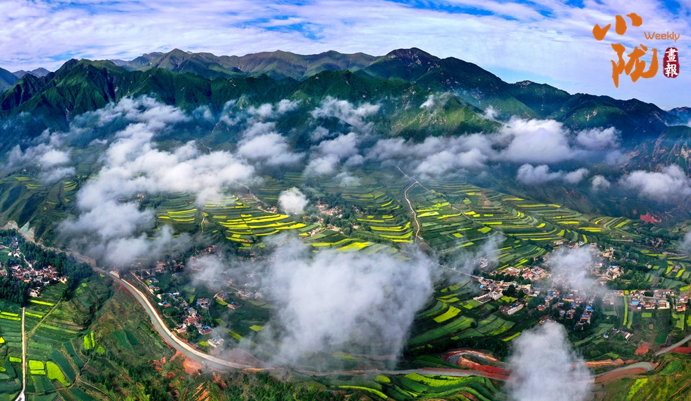 在旅游大通道積石山段遠(yuǎn)眺,云霧穿山飄過(guò),遠(yuǎn)處的村莊和梯田時(shí)隱時(shí)現(xiàn),遠(yuǎn)山近嶺,草樹煙村......置身其中,仿佛步入了人間仙境。
