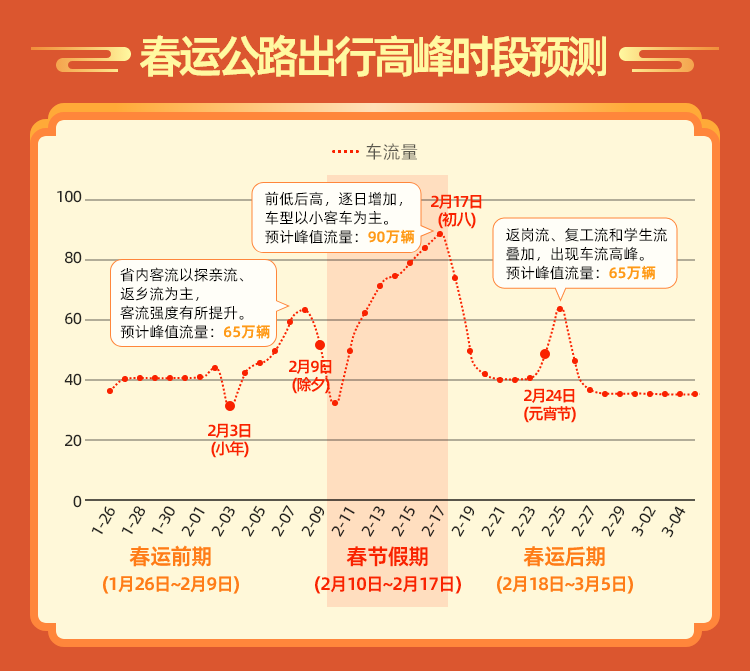 春運前期(1月26日至2月9日):省內(nèi)客流以隴南、天水、嘉峪關(guān)、武威、平?jīng)龅确较虻奶接H流、返鄉(xiāng)流為主,客流強度有所提升,跨省客流以出疆途經(jīng)甘肅返回內(nèi)地的返鄉(xiāng)流為主,出現(xiàn)節(jié)前自西向東的潮汐現(xiàn)象。預(yù)計2月8日(臘月二十九)國省道路交通流量較大,公眾出行迎來集中高峰。此外,受群眾采辦年貨、休閑逛街、中短途探親訪友以及大型活動等多種因素影響,各市城區(qū)貨物市場、繁華商圈等周邊區(qū)域以及部分主干道路,將出現(xiàn)一定的交通壓力。