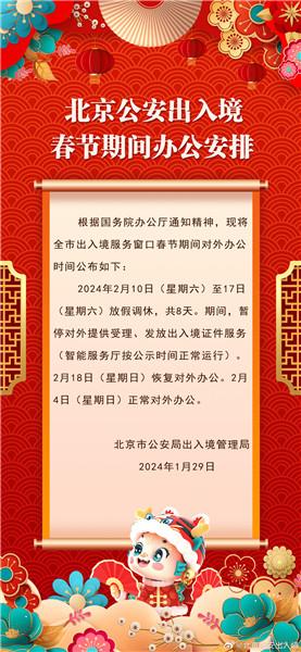 據(jù)北京市公安局出入境管理局官方微博消息,北京市公安局出入境管理局發(fā)布春節(jié)期間辦公安排:北京市出入境服務(wù)窗口2月10日至17日(大年初一至初八)放假調(diào)休,共8天。期間,暫停對(duì)外提供受理、發(fā)放出入境證件服務(wù)(智能服務(wù)廳按公示時(shí)間正常運(yùn)行)。