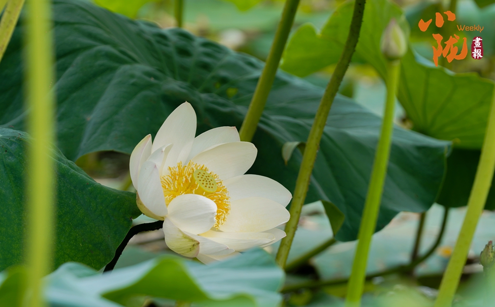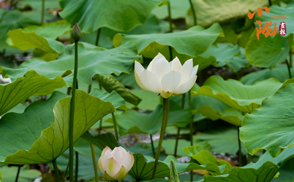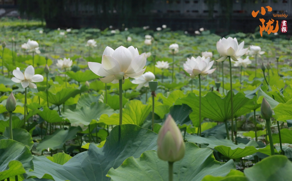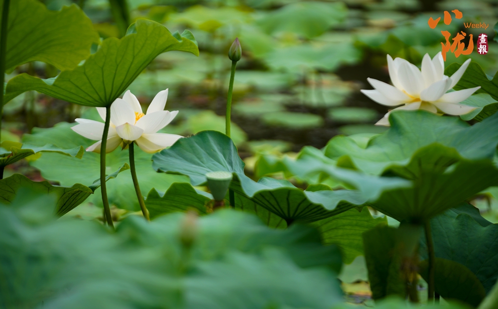一朵朵、一簇簇、白色的荷花星星點(diǎn)點(diǎn)、清美動(dòng)人點(diǎn)綴于成片的翠綠色荷葉間或肆意怒放,或含苞待放形成一幅美麗的生態(tài)畫卷。