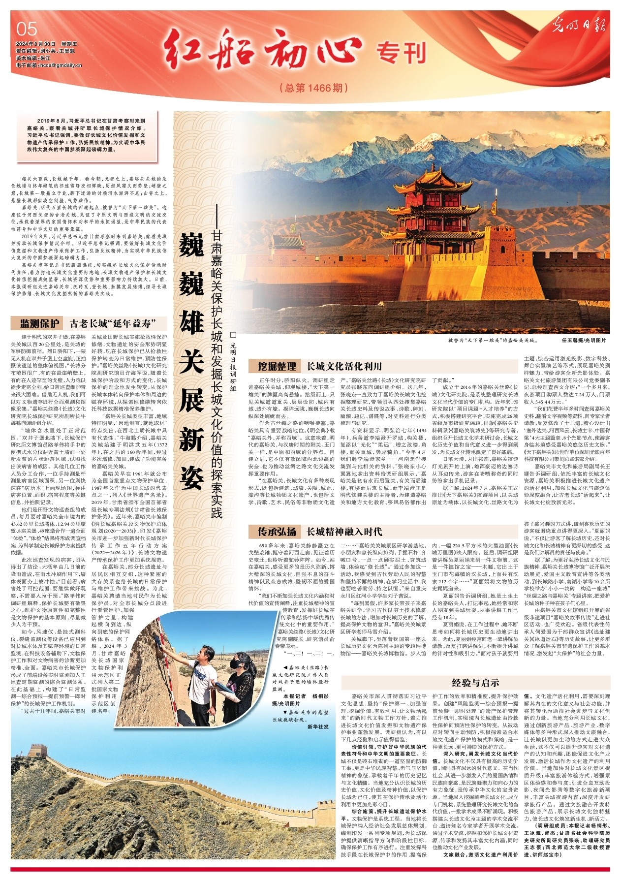 嘉峪關(guān)市牢記總書記殷殷囑托,切實(shí)擔(dān)起長(zhǎng)城文化保護(hù)傳承時(shí)代責(zé)任,著力打造長(zhǎng)城文化重要標(biāo)志地,長(zhǎng)城文物遺產(chǎn)保護(hù)和長(zhǎng)城文化價(jià)值挖掘成效顯著,長(zhǎng)城資源優(yōu)勢(shì)和重要影響力持續(xù)放大。日前,本報(bào)調(diào)研組走進(jìn)嘉峪關(guān)市,撫磚瓦,登長(zhǎng)城,觸摸發(fā)展脈搏,探尋長(zhǎng)城保護(hù)修繕、長(zhǎng)城文化發(fā)掘弘揚(yáng)的嘉峪關(guān)實(shí)踐。