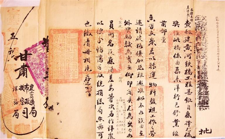 清宣統(tǒng)二年(1910年)5月,陜甘總督長(zhǎng)庚褒獎(jiǎng)修建黃河鐵橋官員批文。