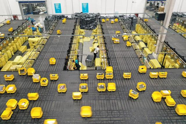 11月7日,浙江省湖州市德清縣乾元鎮(zhèn)第一產(chǎn)業(yè)智慧物流園區(qū)快魚服飾有限公司華東物流中心,800余臺分揀“小黃人”機器人在精準配送各類服飾(無人機照片)。新華社發(fā)(倪立芳攝)